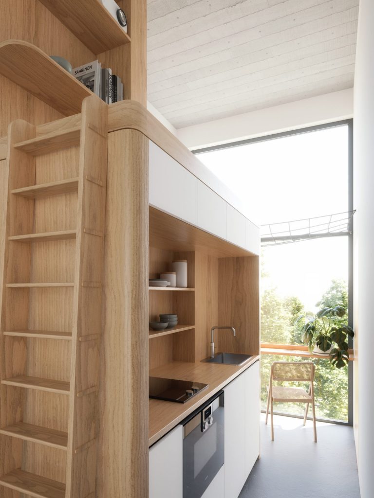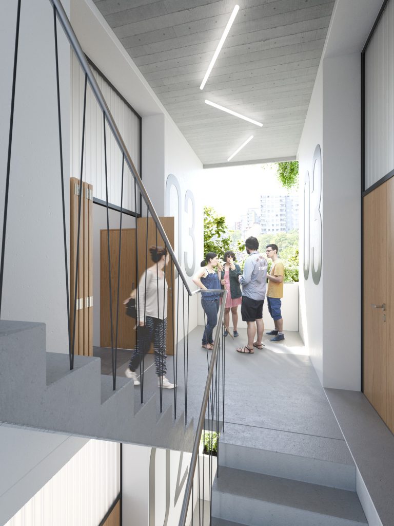 87.5 square feet per resident can seem like a limitation, the micro.tower aims to turn this into a quality. All doors are slidable or foldable and open generously to the outside, so each area feels spacious and flooded with light, thus it never feels confined. While the private space acts as a retreat from busy city life for each resident, it gradually opens up to a larger community. First to the community area in the unit, from there to the neighbors on your floor, then on to the rooftop community and finally to the neighborhood on the ground floor, which is planned for public and commercial usage. The selected site shows that micro.tower can adapt to a busy and densely built-up area.