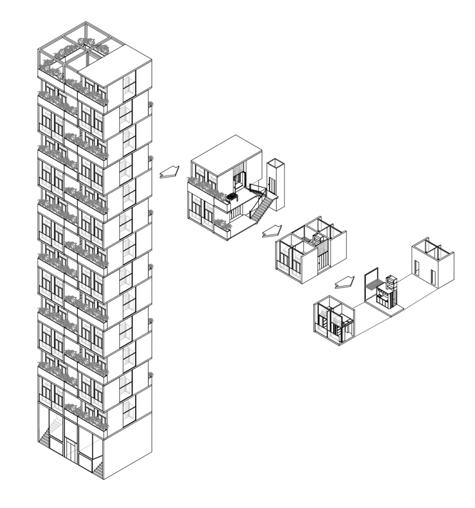 Since life in densely populated cities is becoming more and more expensive and land resources are becoming increasingly scarce, the micro.tower offers a solution for accommodating residents with a minimal footprint. Two modules per floor, each under 350 square feet, are stacked to a tower to inhabit 100 individuals, connected by an open staircase. This allows the usage of small building sites, that are unattractive to most developers.